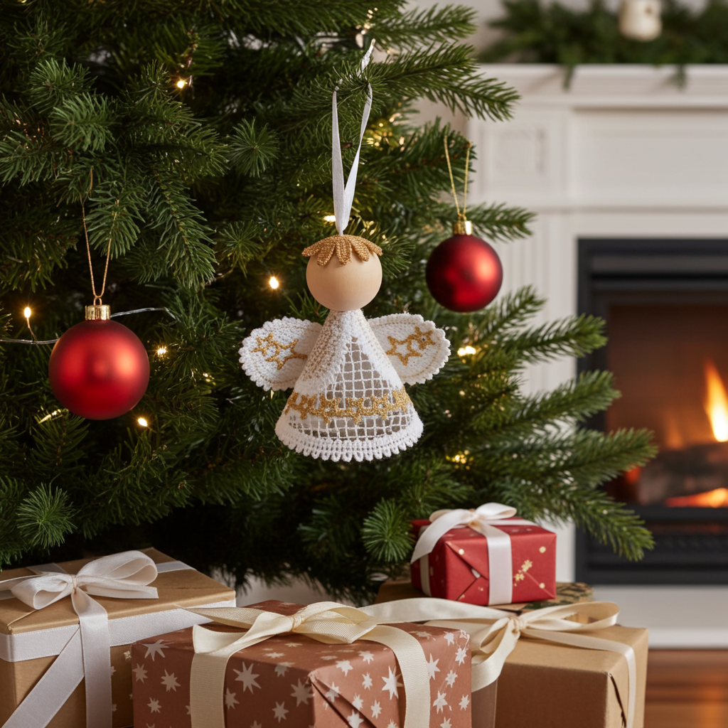 je vytvořen z kvalitních textilních materiálů a díky preciznímu provedení působí jemně a zároveň slavnostně. Zlaté akcenty dodávají andělské postavičce slavnostní nádech, zatímco bílá barva symbolizuje čistotu a duchovní světlo. Vyšívané figurky lze snadno zavěsit – na vánoční stromeček, do okna, na věnec nebo jako součást ozdobného aranžmá na slavnostním stole. Může být také krásným doplňkem dárkového balení nebo malým pozorným dárkem samotným.
